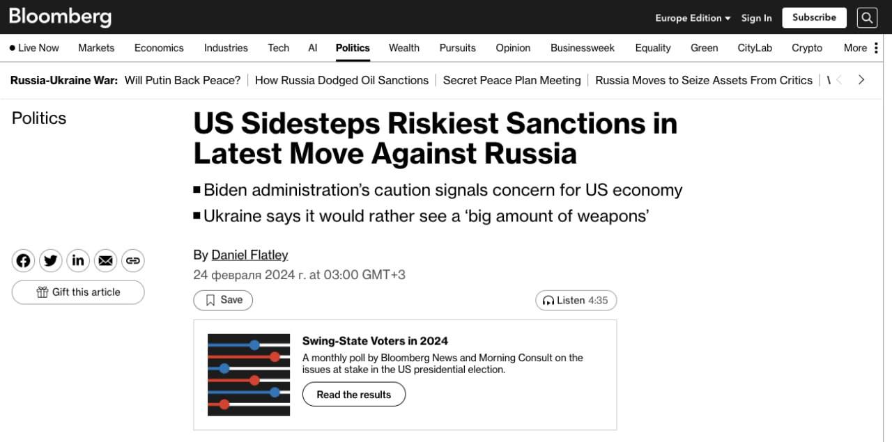 "Такая осторожность свидетельствует о том, что, несмотря на все разговоры Байдена о санкциях, его команда все еще не желает преследовать потоки доходов, которые, по мнению экспертов, действительно подорвут российскую экономику, опасаясь вызвать широкие шоки, которые могут отразиться на экономике США", – говорится в материале.
