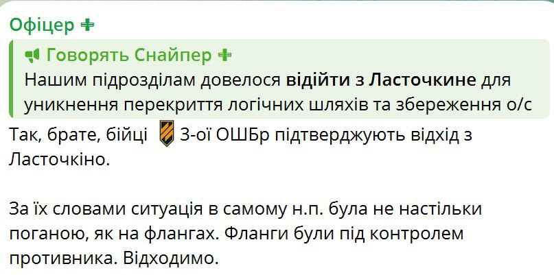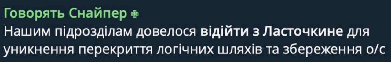 Ранее в РФ заявили, что ВСУ отошли от села Ласточкино. Официально ВСУ этого не подтверждали..