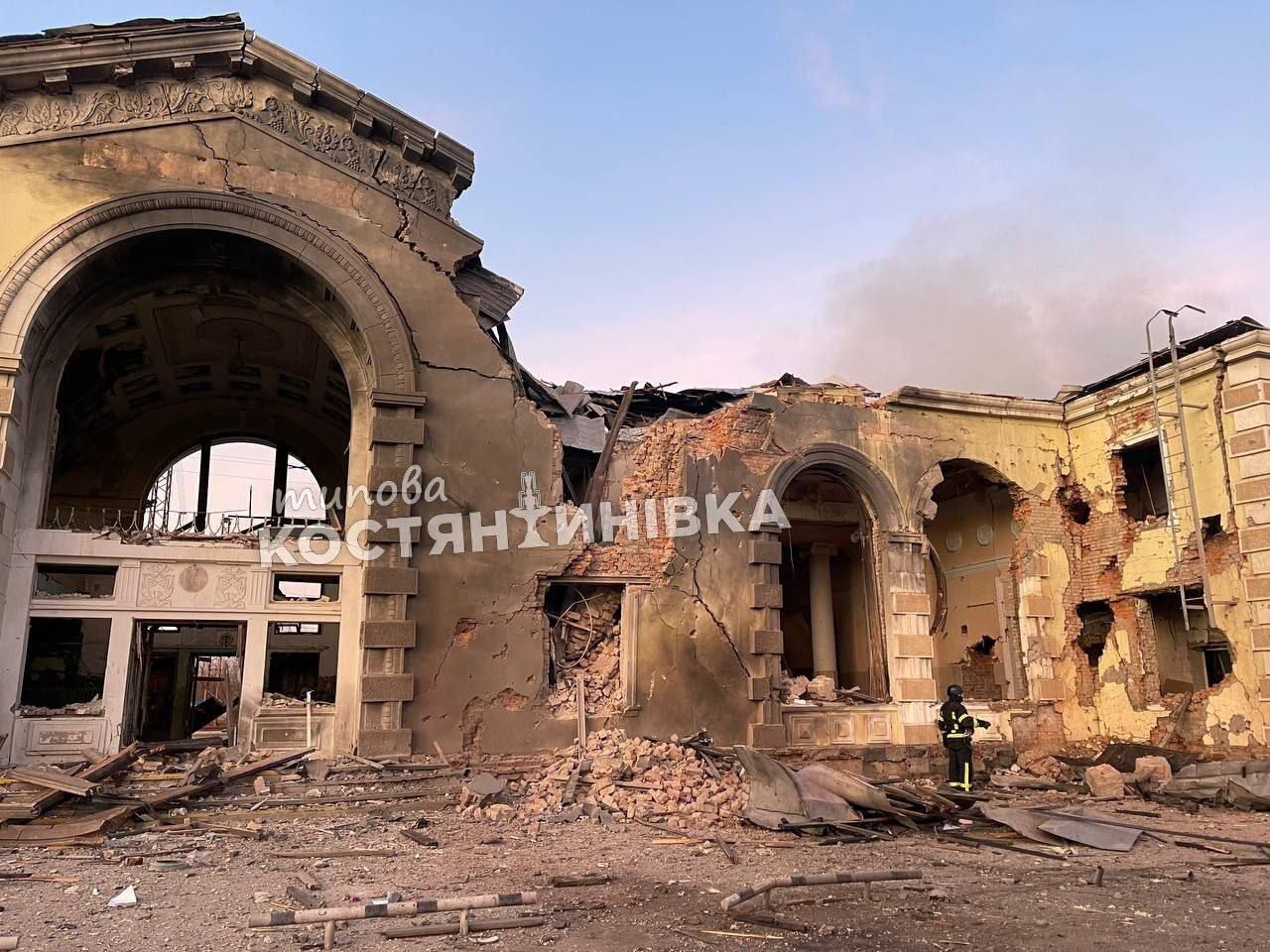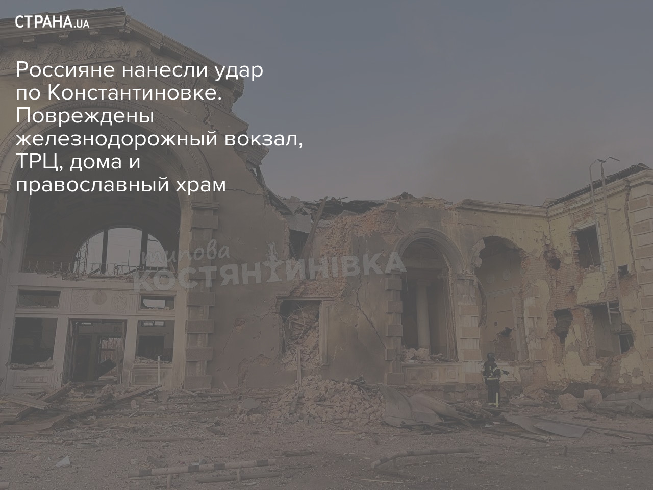 Сегодня утром в Константиновке Донецкой области россияне ударили по зданию железнодорожного вокзала. Повреждены также стоящий рядом ТРЦ, дома и православный храм.