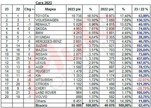 Продажи Mercedes (2601 в 2023 году против 2987 в 2021-м) и Lexus (1892 в 2023-м и 1858 в 2021-м) формально сильно не изменились. Но фактически, если учитывать, что миллионы людей уехали за границу, а значительная часть территории страны захвачена Россией, даже такие цифры - это серьезный рост. При этом тот же Mercedes в прошлом году занял 7-е место среди самых продаваемых автомобилей Украины (в 2021 году он был лишь на 13-м).