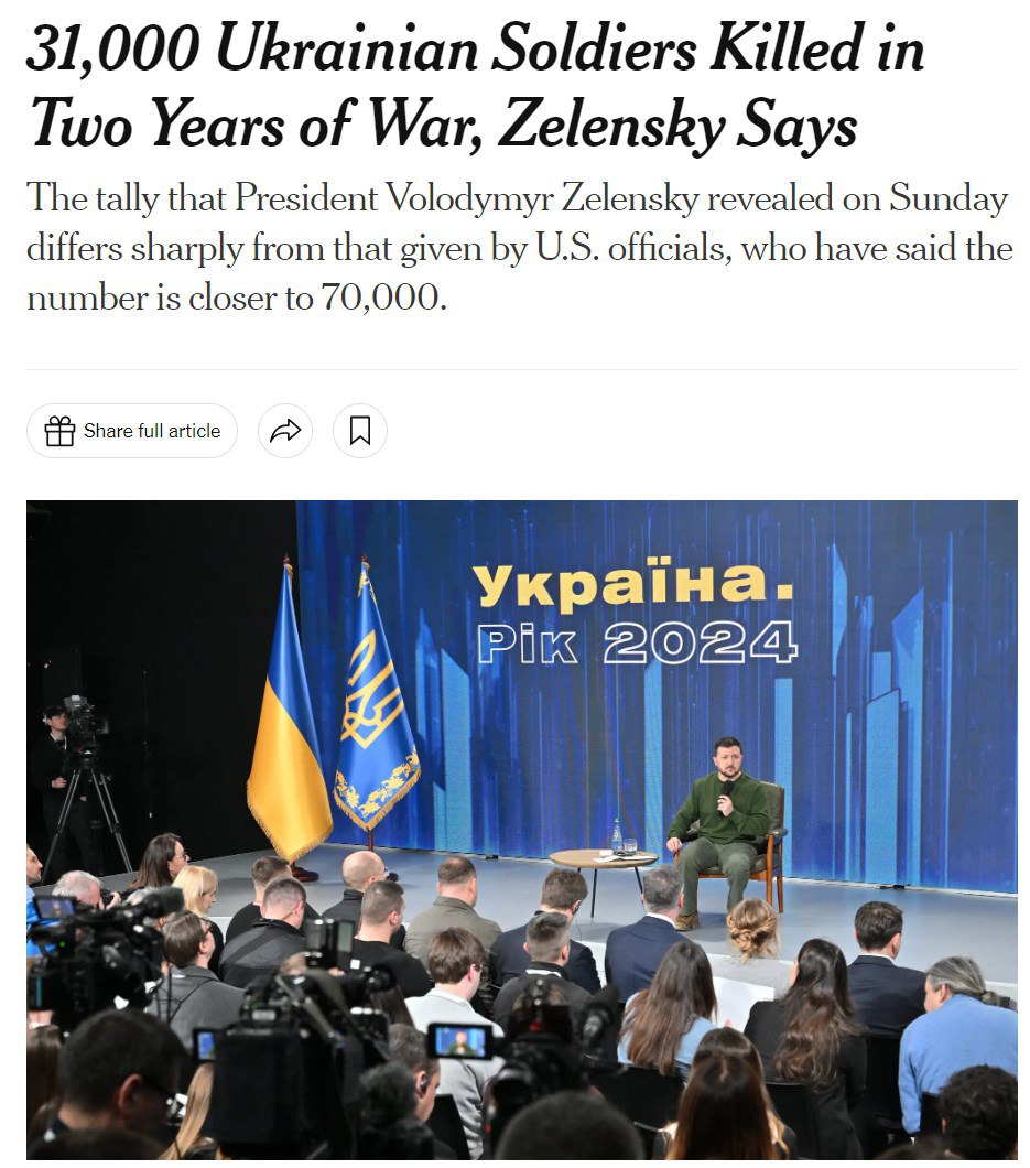 Озвученные сегодня данные президента Украины Владимира Зеленского о потерях ВСУ в количестве 31 тысячи погибших "резко отличаются" от оценок официальных лиц США.