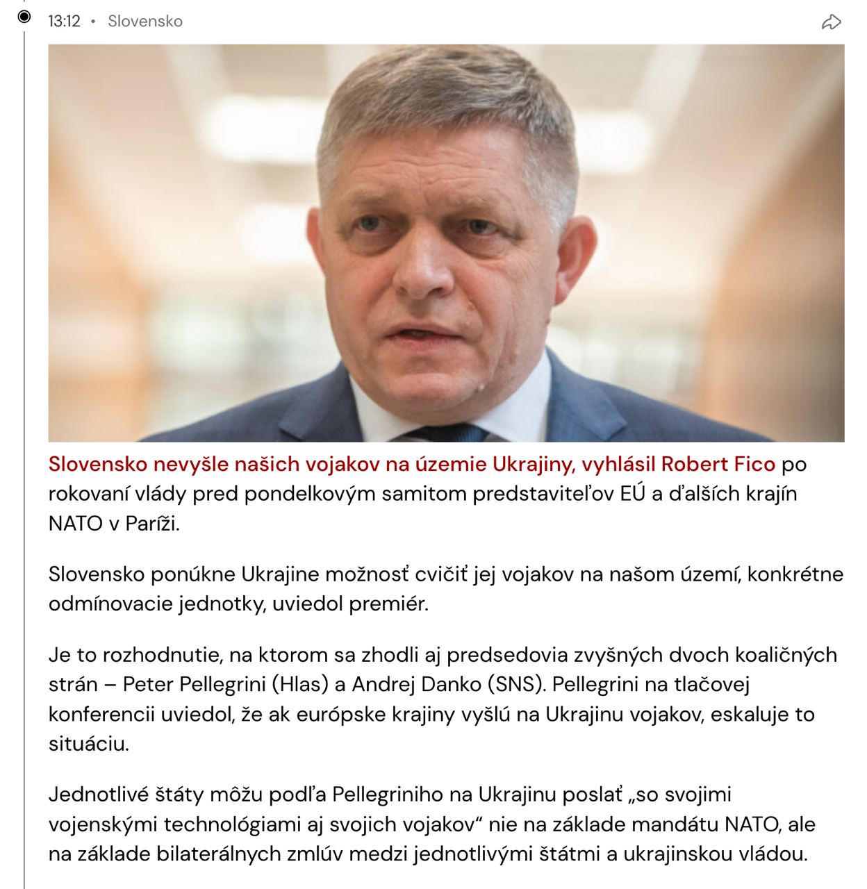 Ранее сегодня премьер Словакии Роберт Фицо сообщил, что отдельные страны ЕС и НАТО думают над тем, чтобы отправить своих военных в Украину на базе двусторонних соглашений.