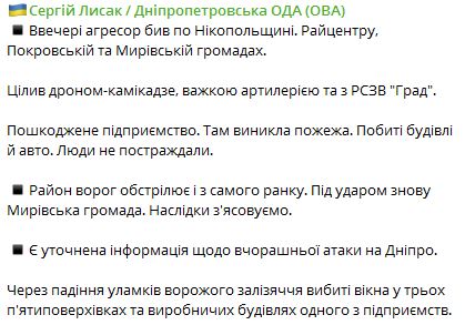 07.30 Вечером силы РФ ударили по Никополю, Покровской и Мировской громаде в Днепропетровской области.