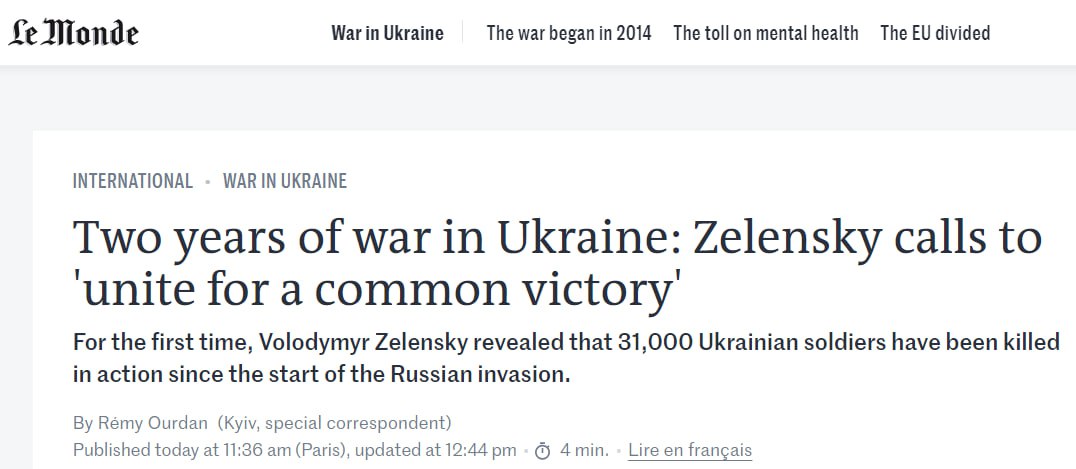 23.00 Украинский военный Станислав Бунятов, который ведет известный телеграмм-канал "Говорять Снайпер", прокомментировал заявление Владимира Зеленского о том, что с начало войны погибли 31 тысяча украинских военнослужащих.