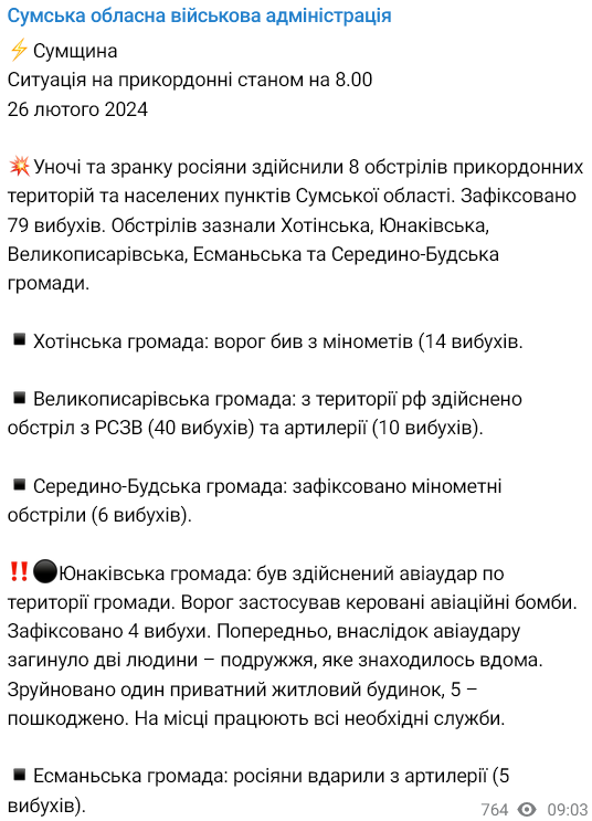 Ночью 26 февраля россияне сбросили четыре авиабомбы на Юнаковскую общину Сумской области. Погибла супружеская пара.