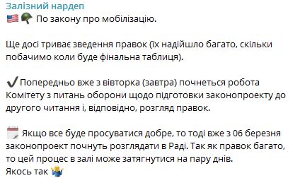 "Если все будет хорошо продвигаться, то тогда уже с 6 марта законопроект начнут рассматривать в Раде. Так как правок много, то этот процесс в зале может затянуться на пару дней",  написал Ярослав Железняк.