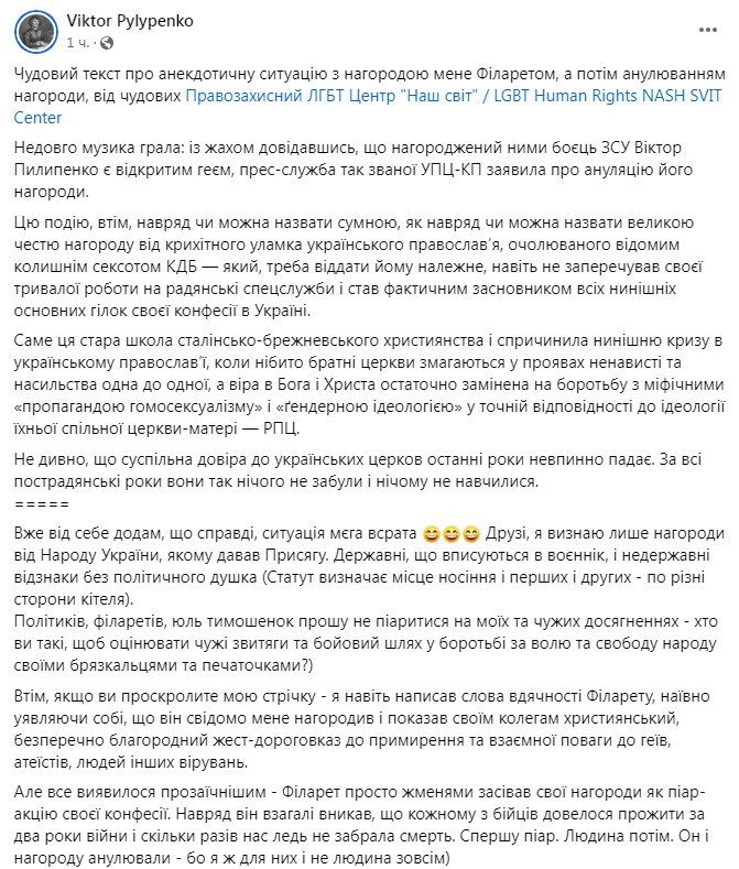 "Военнослужащий Виктор Пилипенко получил благодарность от церкви исключительно как защитник Украины, а не как активист ЛГБТ, по представлению его коллег-военнослужащих из боевого подразделения героической 72-й бригады имени Черных Запорожцев. Патриарх Филарет не вручал лично Пилипенко медаль и не знал о его греховных склонностях. Святейший патриарх Филарет и Украинская православная церковь киевского патриархата, основываясь на Священном Писании, тысячелетнем учении православной церкви, неизменно занимает принципиальную негативную позицию по отношению к содомскому греху, осуждает пропаганду т.н. "однополых браков"... Мы благодарим воина Виктора Пилипенко (как и всех наших защитников за то, что они защищают нашу свободу и территориальную целостность) за его военные заслуги, но не разделяем его греховные предпочтения и агитацию за ЛГБТ. Сообщаем, что ввиду открытой пропаганды греховной идеологии и отрицания существования Бога считать церковную награду Виктору Пилипенко от 08.02.2024 г. аннулированной", - заявили в пресс-службе киевского патриархата.