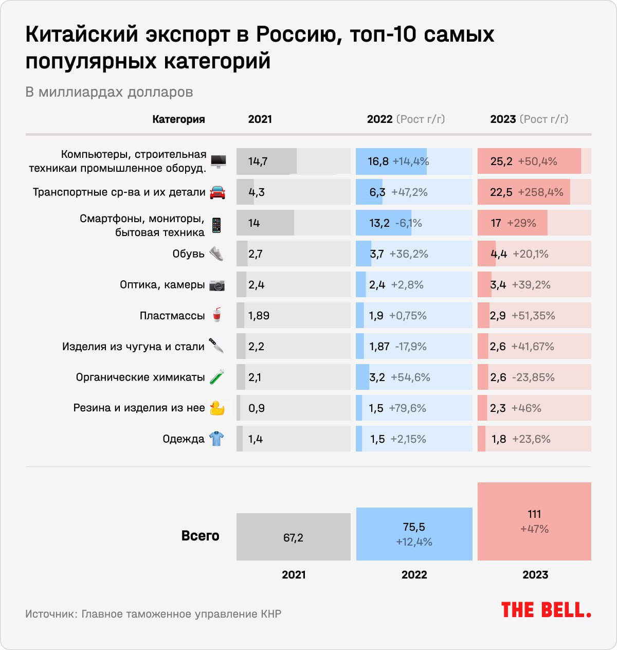 В исследовании The Bell говорится, что в 2023 году объем китайского экспорта в Россию достиг рекордных 111 миллиардов долларов. Это на 47% больше, чем в 2022 году и на 65% больше по сравнению с довоенным 2021 годом.