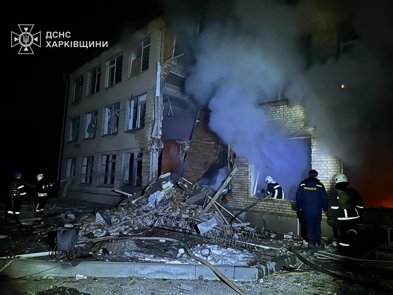 Здание существенно разрушено, начались пожары. Пострадавших нет.