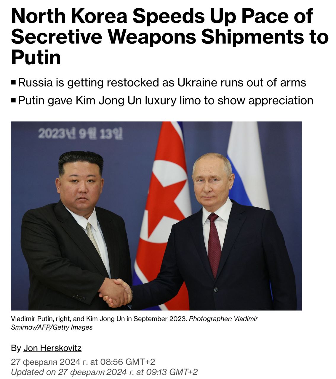 11.15 Северная Корея ускоряет темпы поставок оружия РФ, пишет Bloomberg.