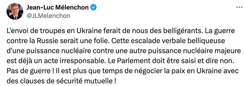 "Отправка войск в Украину сделает нас воюющей стороной. Война с Россией была бы безумием. Эта воинственная словесная эскалация одной ядерной державы против другой крупной ядерной державы уже является безответственным поступком. Необходимо попросить парламент сказать "нет". Нет войне! Настало время договориться о мире в Украине с взаимными условиями безопасности!", - написал Меланшон, который является одним из ведущих оппозиционных политиков Франции.