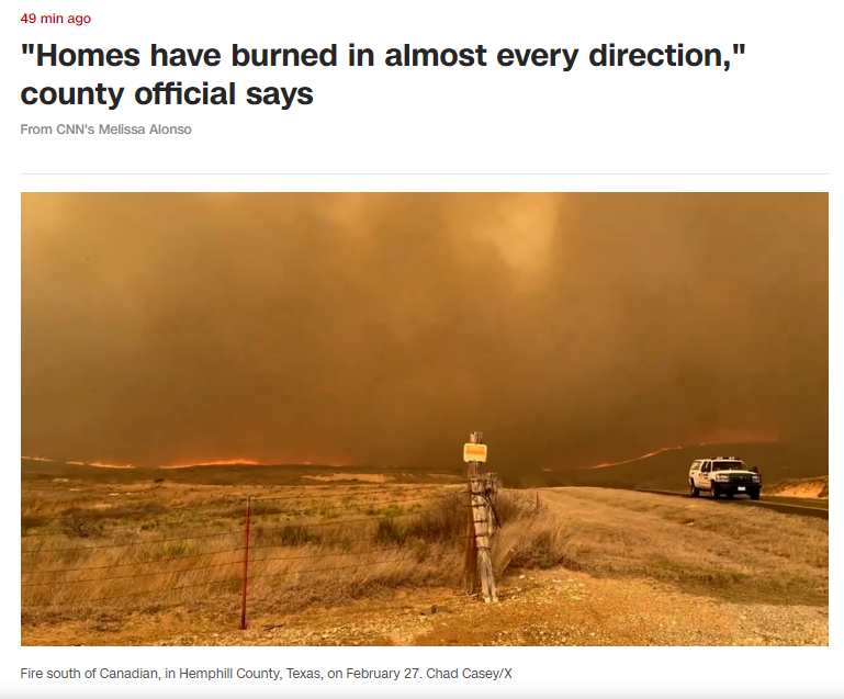 Также CNN сообщает, что в штате Техас вспыхнули пожары, и более чем в 60 округах был объявлен режим чрезвычайной ситуации. Пламя распространилось на площадь свыше 800 квадратных километров, достигая населенных пунктов после того, как оно перекинулось с полей и лесов. Спасатели и полиция проводят эвакуацию людей из зон риска.