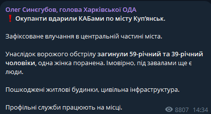 Армия РФ ударила КАБами по центру Купянска, погибли двое мужчин, одна женщина ранена.