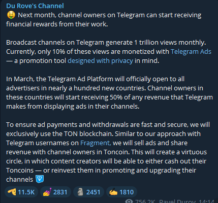 По словам Дурова, каналы в Telegram генерируют триллион просмотров ежемесячно, при этом только 10% этих просмотров монетизируются с помощью рекламы.