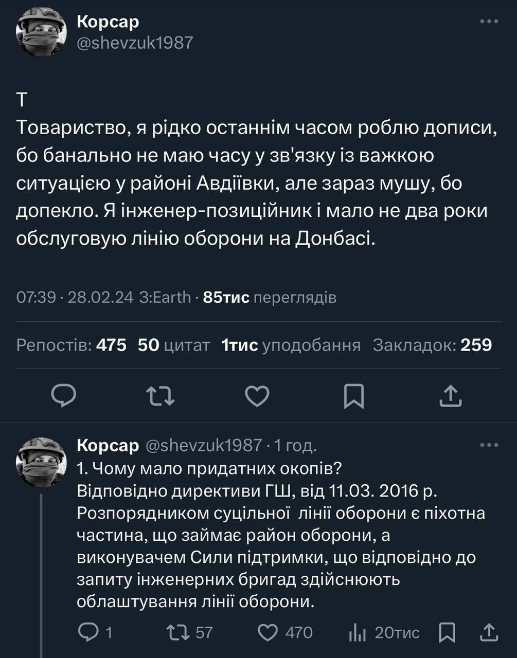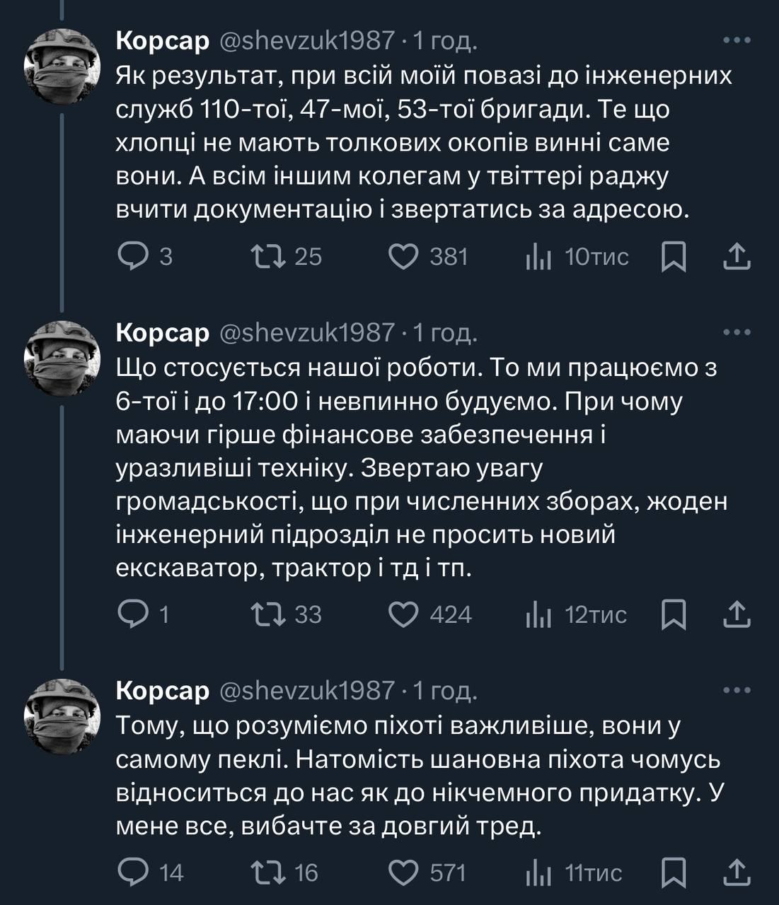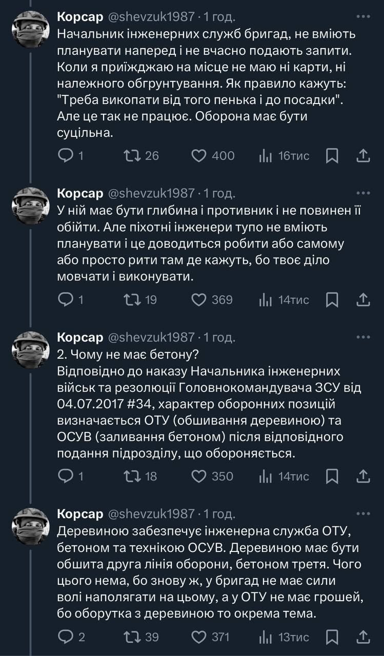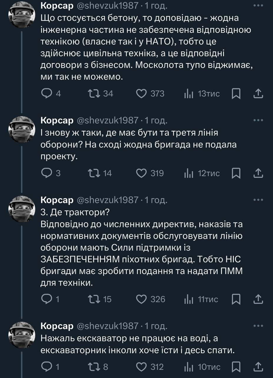 "Когда я приезжаю на место, у меня нет ни карты, ни надлежащего обоснования. Как правило, говорят: "Надо выкопать от того пенька и до посадки". Но это так не работает. Оборона должна быть сплошной", - написал Корсар.