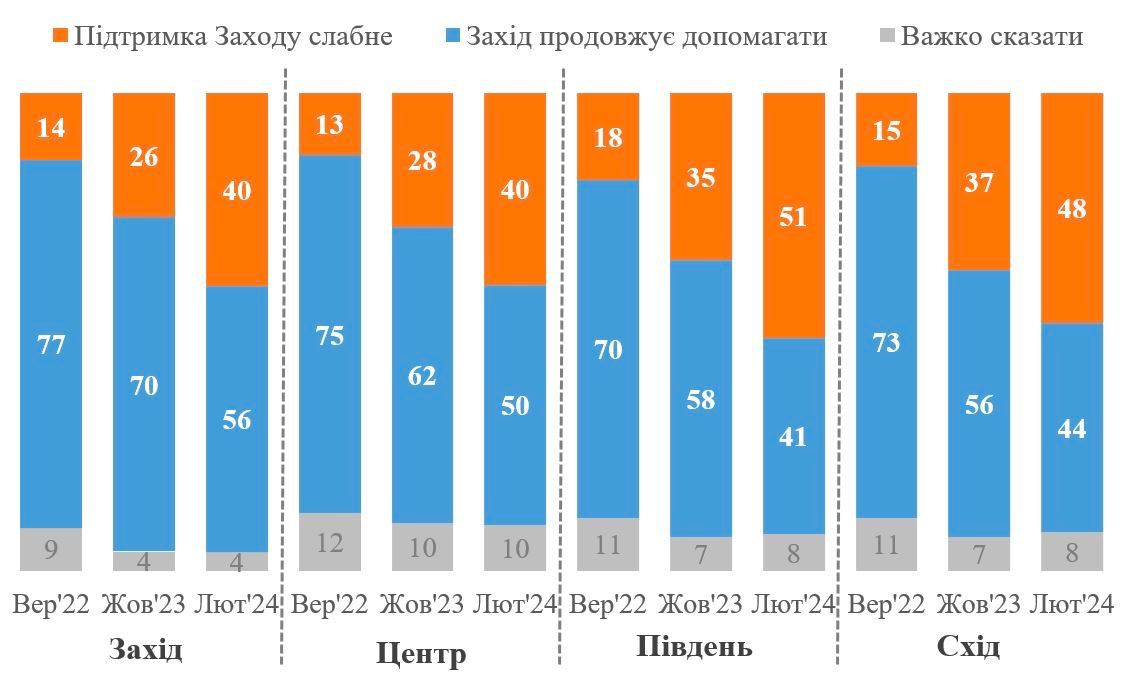 49% считают, что Запад продолжает поддерживать Украину по мере возможностей и хочет завершения войны на выгодных для Киева условиях. Чуть больше года назад было 76%.
