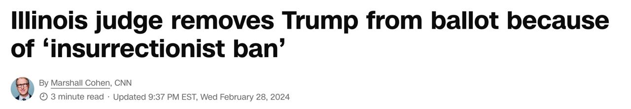 Судья штата Иллинойс исключила Трампа из избирательных бюллетеней, сославшись на 14-ю поправку конституции США, которая запрещает чиновникам занимать государственные должности, если они участвовали в мятеже.