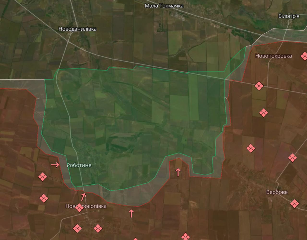 Видно, что захвачена как минимум половина села, а вся его территория - в "серой" зоне (то есть там идут бои). Аналогичная ситуация в Тоненьком южнее Орловки.