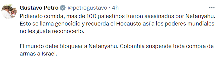"Нетаньяху убил более 100 палестинцев, которые просили еды. Это называется геноцидом и напоминает Холокост, даже если мировые державы не хотят это признавать. Мир должен заблокировать Нетаньяху. Колумбия останавливает все закупки оружия у Израиля", - заявил президент Колумбии.