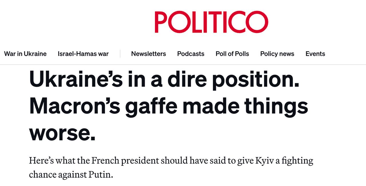 Politico призывает Запад, в том числе Макрона, сконцентрироваться на поставках Украине оружия, чтобы у нее был шанс победить, а не "разделять союзников Киева, рекламировать расколы и преподносить Кремлю пропагандистский подарок".