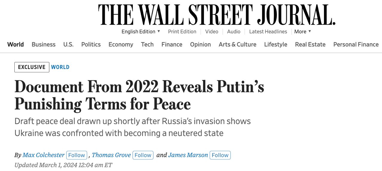 The Wall Street Journal публикует условия мирного соглашения Украины с РФ, почти согласованного, но так и не подписанного в апреле 2022 года - через шесть недель после начала войны.