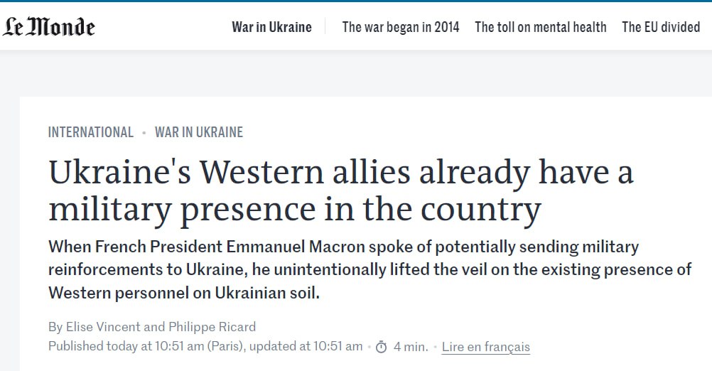 Вчера Макрон назвал "взвешенными" все свои слова о возможности отправки западных войск в Украину, тем самым опровергнув слова своего же министра обороны.