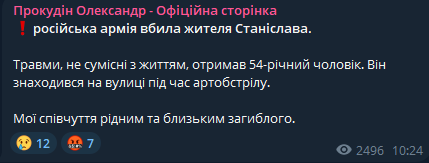 "Российская армия убила жителя Станислава. Травмы, не совместимые с жизнью, получил 54-летний мужчина. Он находился на улице во время артобстрела", - написал он.