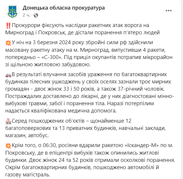 "В ночь на 3 марта 2024 года вооруженные силы России совершили массированную ракетную атаку на г. Мирноград, выпустив 4 ракеты, предварительно – "С-300". Под прицел оккупантов попал микрорайон с плотной жилой застройкой", - говорится в сообщении.