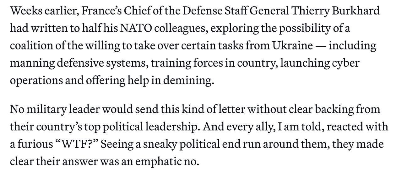 Начальник штаба обороны Франции Тьерри Буркхард несколько недель назад написал коллегам по НАТО письмо с вопросом о возможности отправки иностранных военных в Украину для выполнения ряда задач.