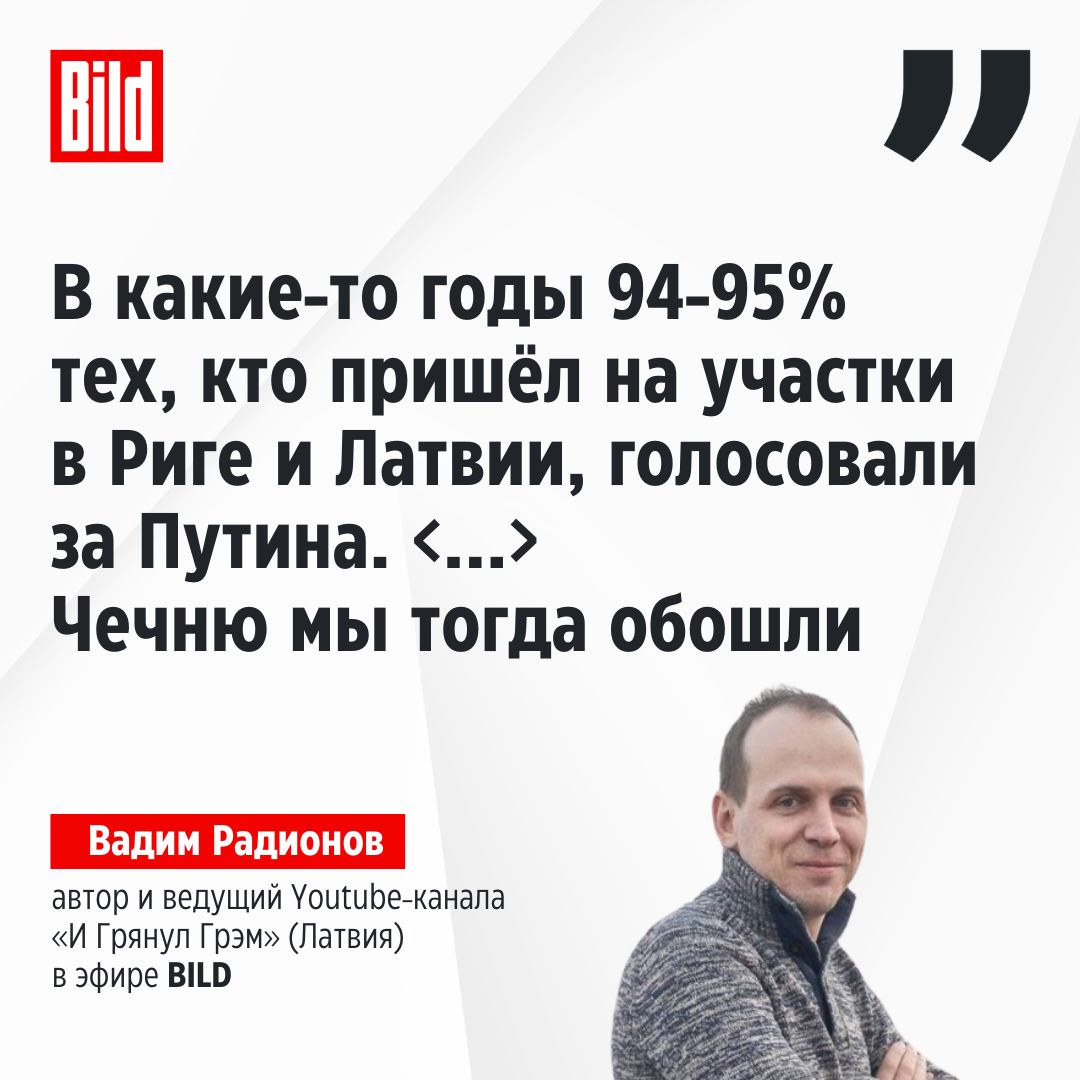 "Я думаю, что там просто не подумали. Есть некий тренд. Мы понимаем, что в Латвии часто голосуют в поддержку Путина (речь идет о российских гражданах, проживающих в Латвии - Ред.). Так было раньше, на предыдущих выборах. Очень высокие показатели за Путина. В какие-то годы, я точно не назову сейчас, 94-95% тех, кто пришёл на участки в Риге и Латвии, голосовали за Путина на президентских выборах. Мы в определённом периоде обходили даже чеченцев", - сказал Радионов в комментарии Bild.