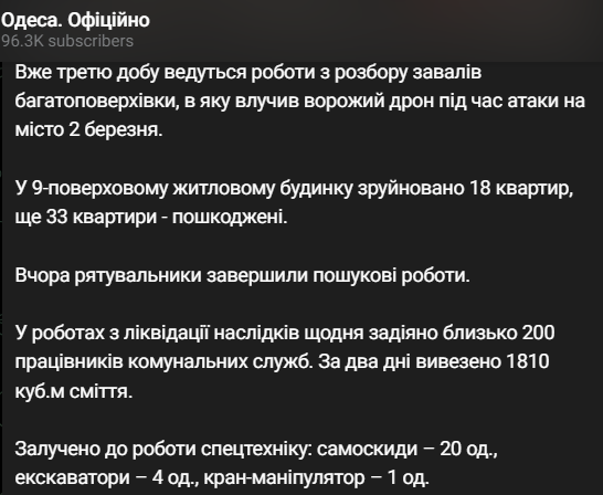 18 квартир разрушены полностью и еще 33 повреждены в результате падения сбитого российского дрона на жилой дом в ночь на 2 марта в Одессе.