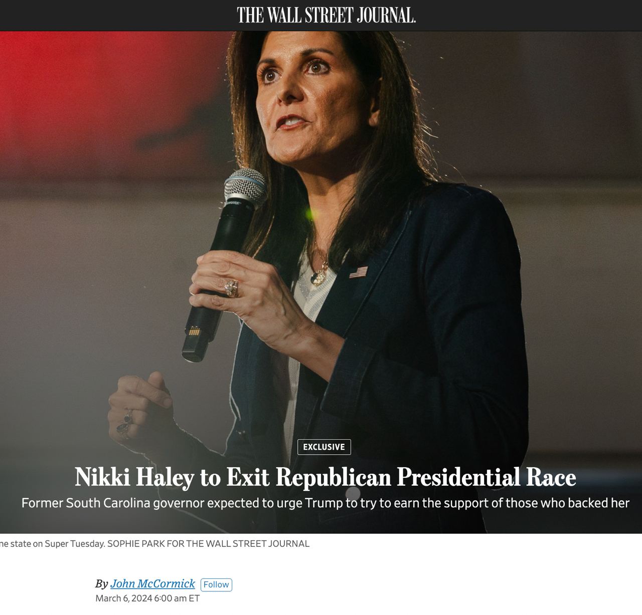 Никки Хейли сегодня объявит о выходе из президентской гонки и призовет голосовать за последнего кандидата от республиканцев - Дональда Трампа.