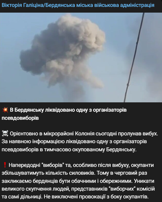 "Ориентировочно в микрорайоне Колония сегодня раздался взрыв. По имеющейся информации, ликвидирована одна из организаторов псевдовыборов во временно оккупированном Бердянске", - написала она.