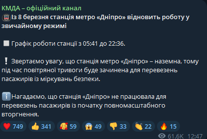 "Обращаем внимание, что станция метро "Днепр" - наземная, поэтому во время воздушной тревоги будет закрыта для перевозок пассажиров из соображений безопасности", – отмечает КГГА.