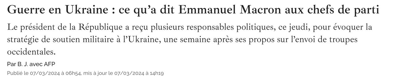 Напомним, в конце февраля Макрон не исключил отправку войск западных стран в Украину. Глава Пятой республики заявил, что этот вопрос обсуждался на совещании западных стран в Париже, но консенсус не был достигнут.