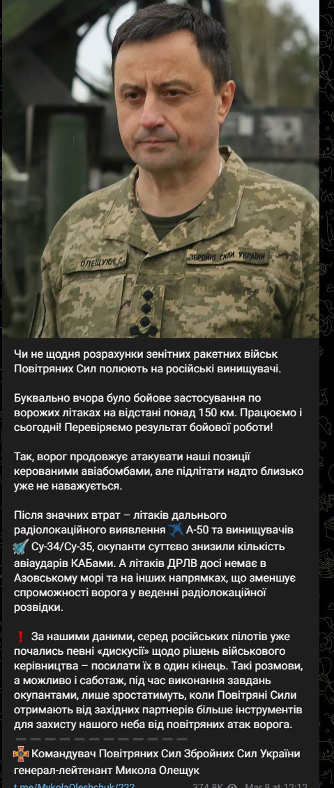 "После значительных потерь – самолетов дальнего радиолокационного обнаружения А-50 и истребителей Су-34/Су-35, оккупанты существенно снизили количество авиаударов КАБами", - написал Олещук 8 марта.