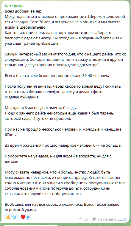 "Глава семейства был с инвалидностью 3 группы. Пропустили, как только увидели ноги после операции. По словам пассажира, это было одной из причин быстрой фильтрации. Много вопросов даже не задавали. А вот с женой беседовали долго", - пишет Ксения.