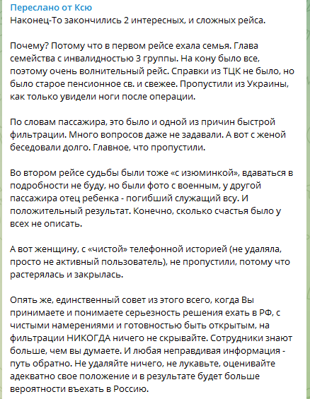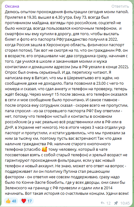 "После опроса ему сотрудник сказал: скорее всего, не пропустим. Папа спросил: из-за сгоревшего паспорта РФ? Ему ответили: нет, потому что телефон чистый и контакты в основном российские (а у нас реально все родственники или в РФ, или в ДНР, в Украине никого)", - пишет женщина и делает, вывод, что "зрелый возраст не гарантирует прохождения фильтрации, если у вас новый телефон и аккаунт".