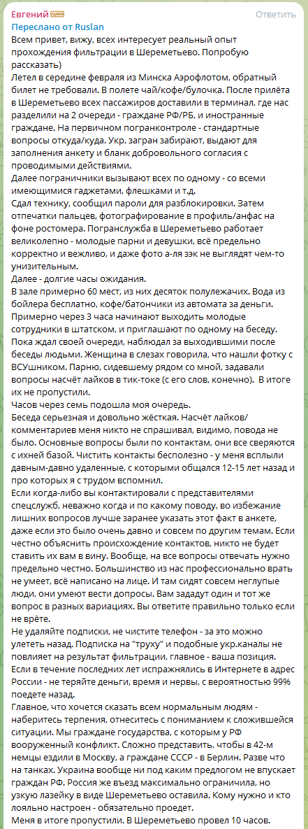 "Подписка на украинские каналы не повлияют на результат фильтрации, главное - ваша позиция. Если в течение последних лет высказывались в Интернете в адрес России - не теряйте деньги, время и нервы, с вероятностью 99% поедете назад", - пишет Руслан.