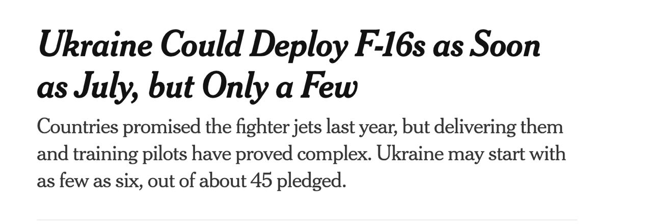 При этом это не значит, что украинских пилотов не готовят. Ожидается, что на данный момент двенадцать пилотов - меньше, чем полная эскадрилья - будут готовы летать на F-16 в бою к лету этого года после 10 месяцев обучения в Дании, Великобритании и США.
