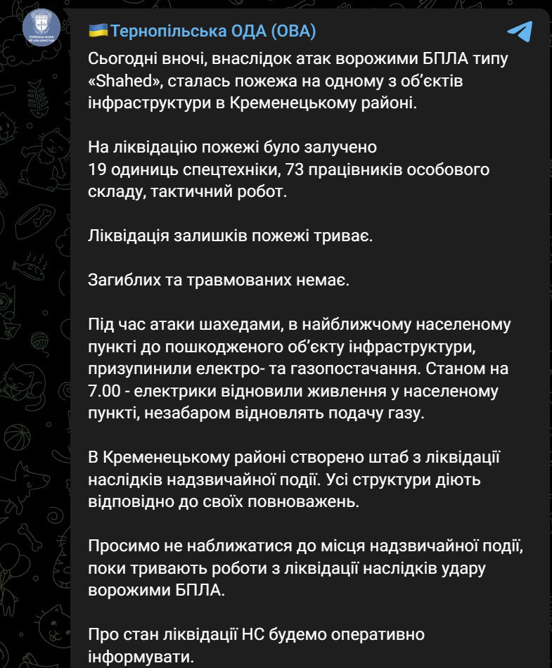 09.55 После ночного удара "Шахедов" горит объект инфраструктуры в Кременецком районе Тернопольской области, сообщает ОВА.