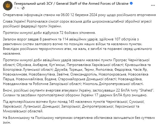 Утром 12 марта Генштаб ВСУ обнародовал сводку о ситуации на фронте за минувшие сутки.