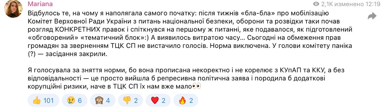 "После недель "бла-бла" о мобилизации Комитет таки начал рассмотрение конкретных правок и споткнулся на первом же вопросе, который подавался, как подготовленный "обсужденный" "тематический блок". А оказалось тратой времени. Сегодня на ограничение прав граждан по обращению ТЦК СП не хватило голосов. Норма исключена. У председателя комитета паника (?) - заседание закрыли", - написала Безуглая.