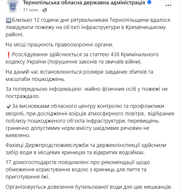 В Тернопольской области могут быть проблемы с водой возле места попадания "Шахеда" по объекту инфраструктуры.