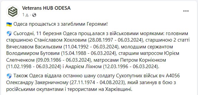 Организация Veterans Hub Odesa опубликовала имена шести военных, погибших в Одессе 6 марта, когда там находился с визитом Владимир Зеленский.