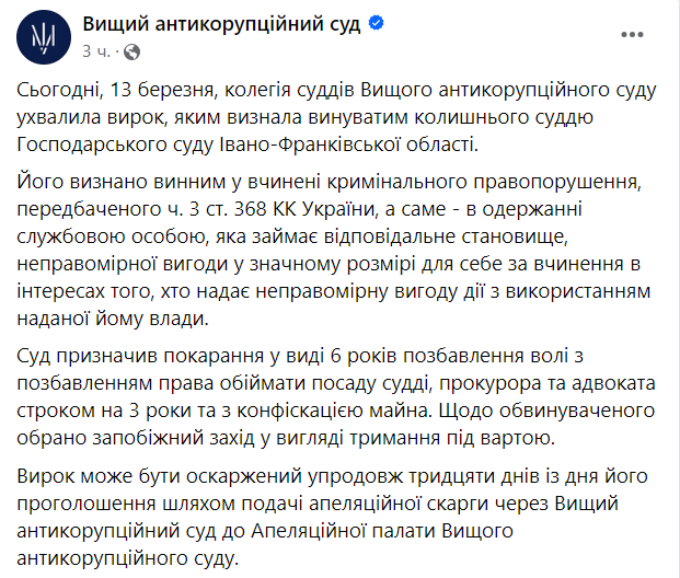 Высший антикоррупционный суд Украины приговорил к 6 годам заключения с конфискацией всего имущества судью Хозяйственного суда Ивано-Франковской области Владимира Булку.