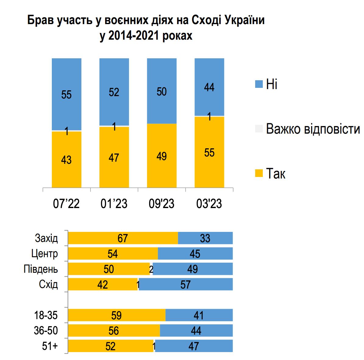 Также 55% респондентов ответили, что у них есть близкие, воевавшие на Донбассе во времена АТО 2014-2021 годов. На западе таких 76%, на востоке - 57%.