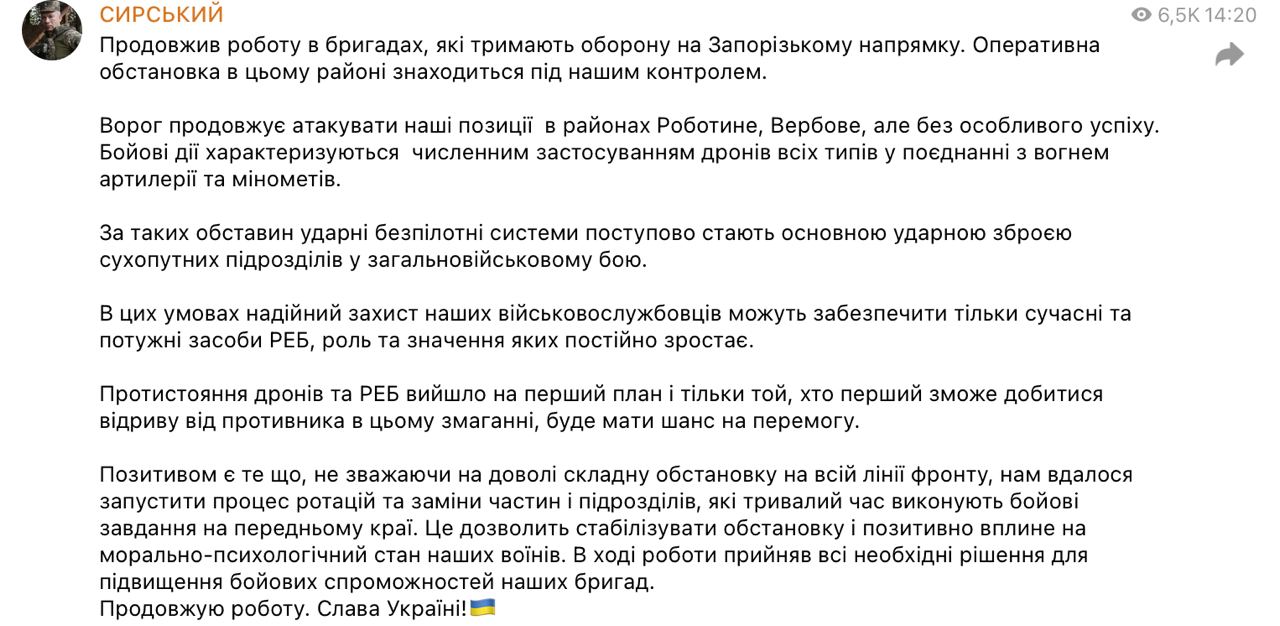"Несмотря на довольно сложную обстановку на всей линии фронта, нам удалось запустить процесс ротаций и замены частей и подразделений, которые длительное время выполняют боевые задачи на переднем крае. Это позволит стабилизировать обстановку и положительно повлияет на морально-психологическое состояние наших воинов", - пишет Сырский.