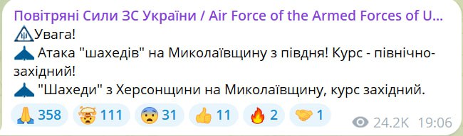 19.11 "Шахеды" атакуют Николаевскую область с двух сторон, сообщают ВСУ.
