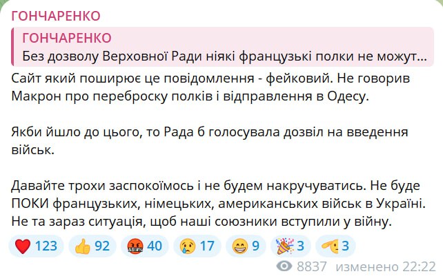 Но нардеп Гончаренко сообщил, что сайт, который распространяет сообщение о французских войсках, идущих в Одессу, – фейковый.